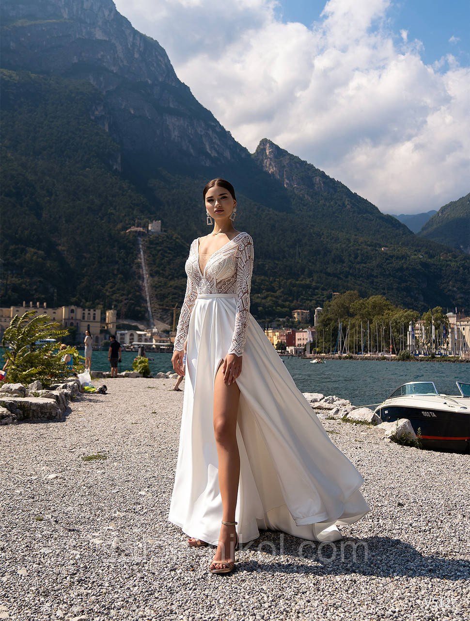 Весільна сукня в молочному кольорі, в наявності розмір - 48. Розріз на лівій стороні спідниці, спинка V-образна на гудзиках. Мереживо прикрашене камінцями та бісером, тканина спідниці - королівський атлас