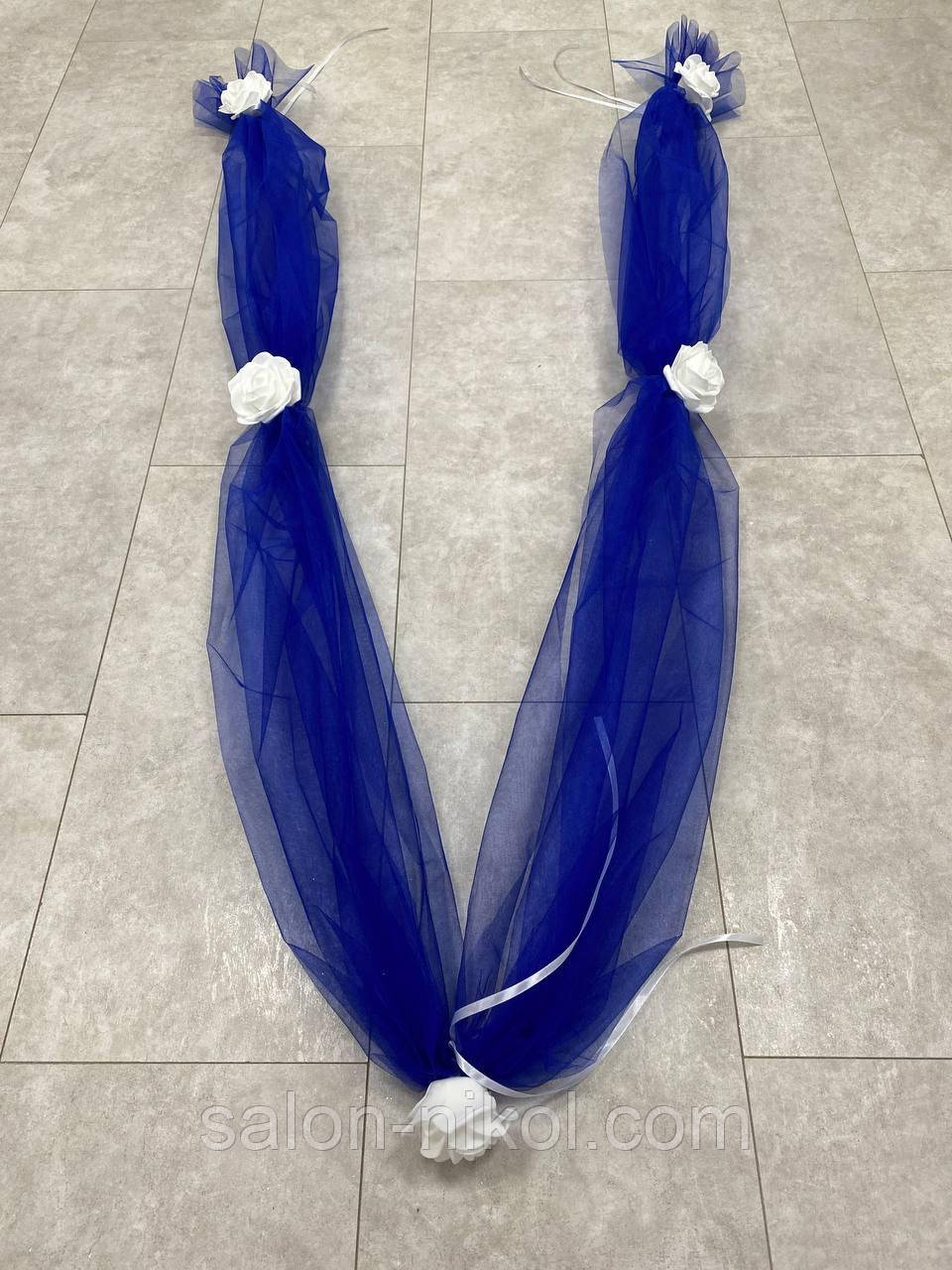 Стрічка на автомобіль фатинова синього кольору з латексними трояндами. Прикраса на весільну машину